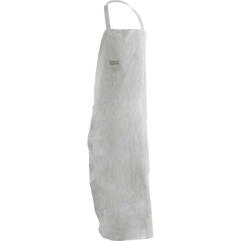 Avental de segurança confeccionado em raspa, tiras em raspa e fivelas na cintura e no pescoço para ajustes.