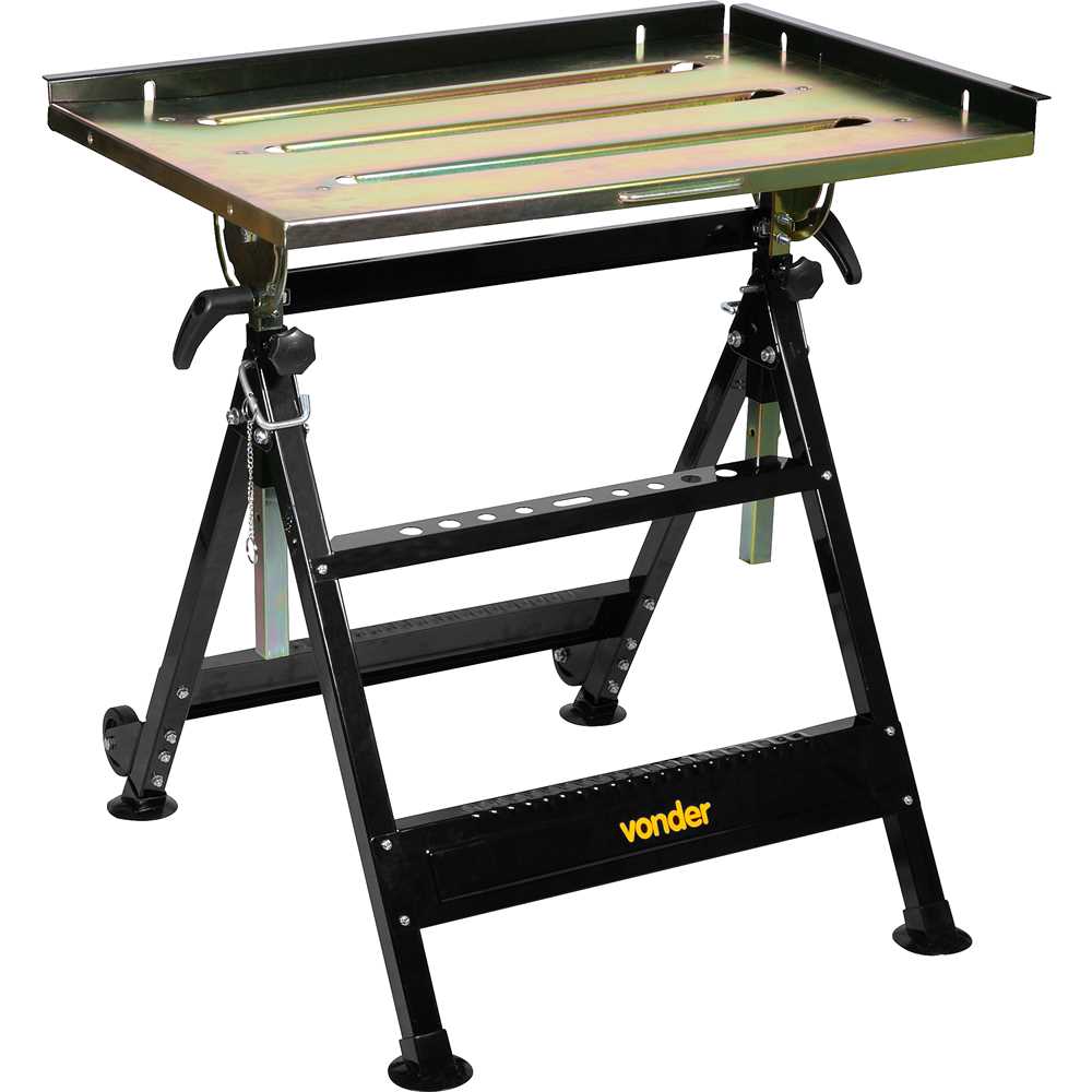 Mesa ajustável em 3 posições diferentes (180°, 90°e 45°), ajuste de altura para adequar de acordo com o trabalho realizado e travessa com encaixes porta-ferramentas.