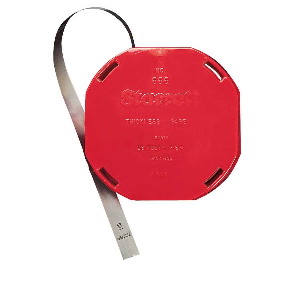 Calibrador de folga em rolo, Série 666, pode ser cortado em qualquer comprimento. Feito de aço temperado com 13 mm (1/2") de largura. Rolo com 7,6 metros (25"), em estojo rebobinador. Medição em milímetros.