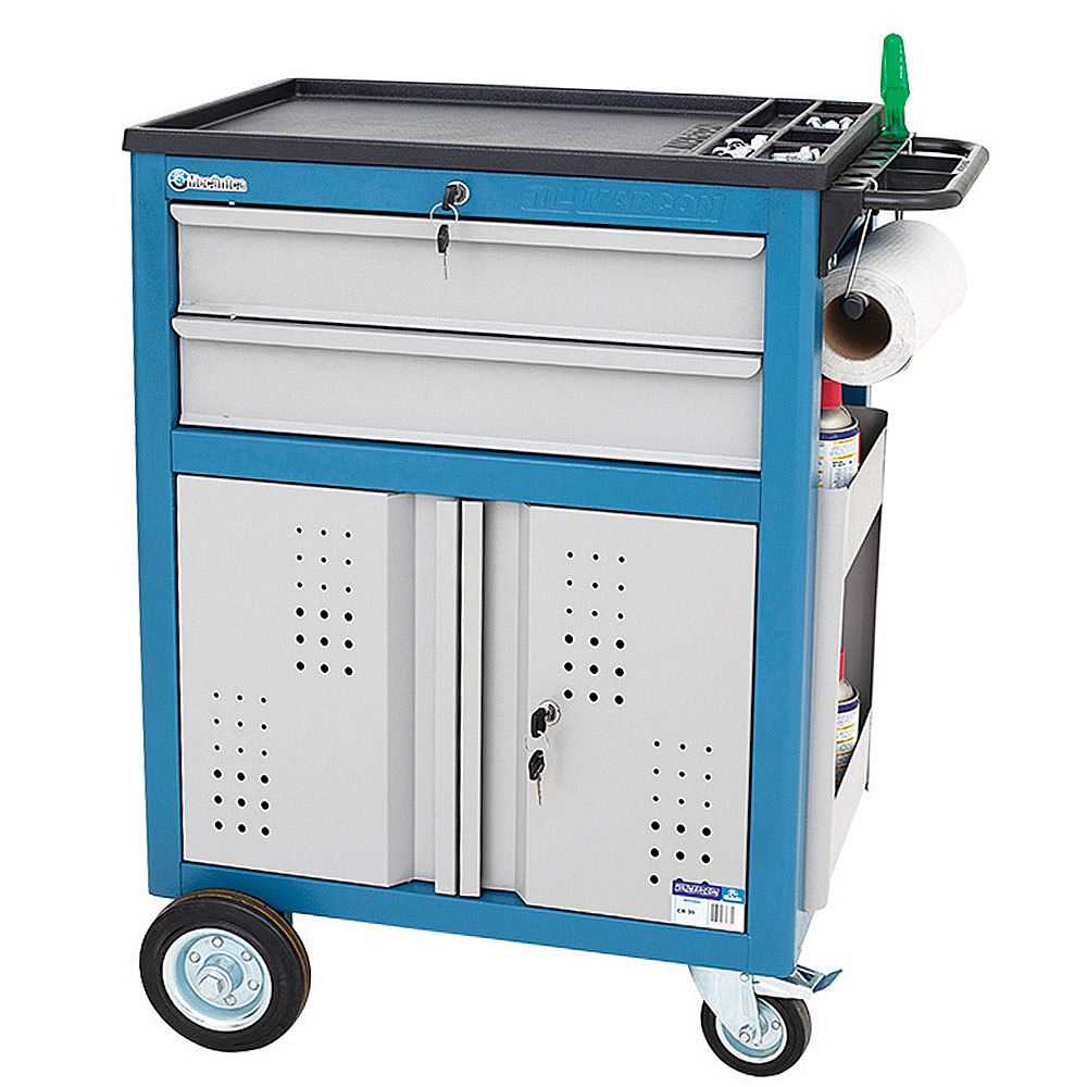 Possui estrutura reforçada com 2 gavetas em metal, portas de aço, fechamento com chave, 2 rodízios fixos, 2 rodízios giratórios com freio e alça para movimentação.