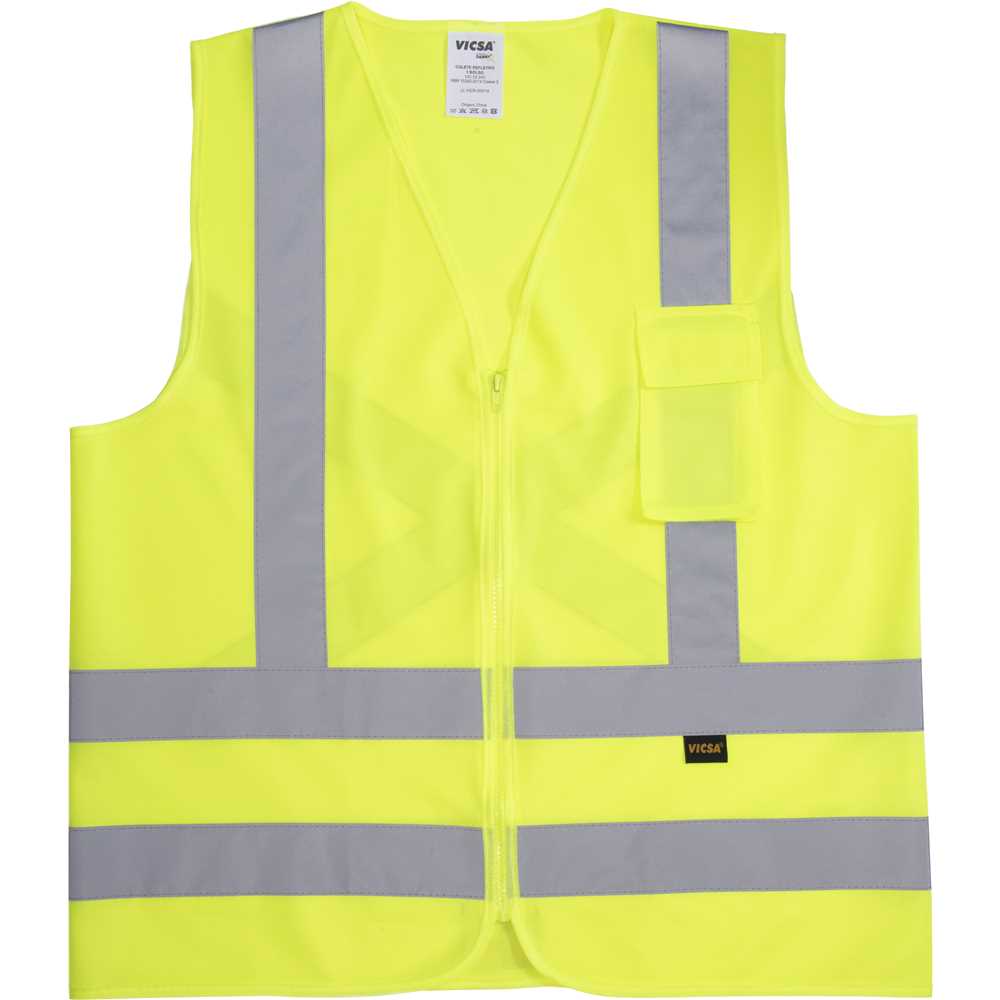 Colete de sinalização de alta visibilidade, com 1 bolso. Confeccionado em tecido fluorescente 100% poliéster, combinado com faixas retrorrefletivas repelentes de água em X, com paralelas horizontais nas costas, verticais e horizontais na parte frontal, fechamento frontal em zíper.