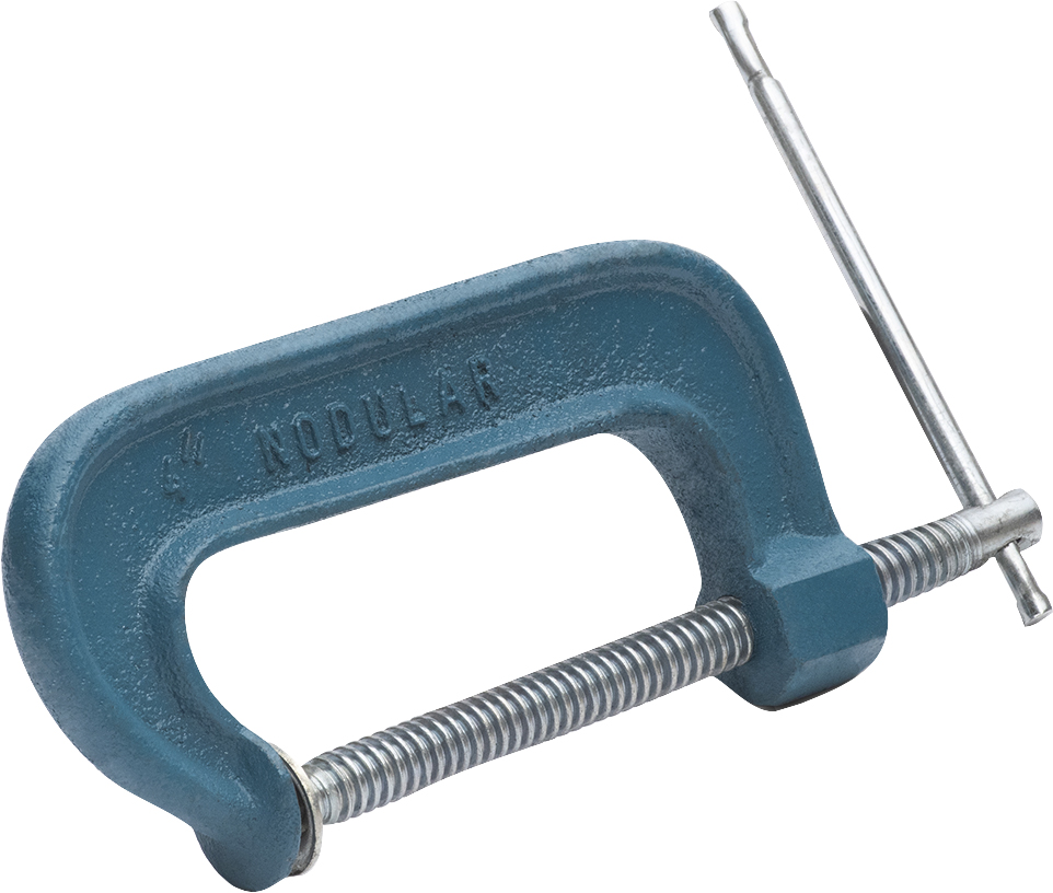 Grampo sargento tipo C, fabricado em ferro fundido (ferro nodular ABNT NBR 6916 - FE 42012 (DIN 1693 - GGG 40)), que garante resistência, durabilidade e firmeza na fixação de peças. Fuso em aço 1020 com rosca trapezoidal zincada. Ampla abertura do mordente e alavanca em aço 1020.