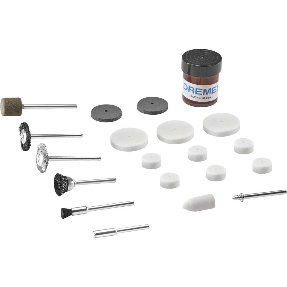 1 Jogo de acessórios para microrretífica, composto por: 1 estojo, 1 escova de cerdas (403), 1 escova de cerdas (404), 1 escova de cerdas (405), 6 discos de polir (414), 1 pasta de polimento (421), 1 ponta de polir (422), 1 disco de polir (425), 1 escova de aço carbono (428), 3 discos de polir (429), 1 disco duro de polimento (420), 1 mandril (401) e 1 mandril (402).