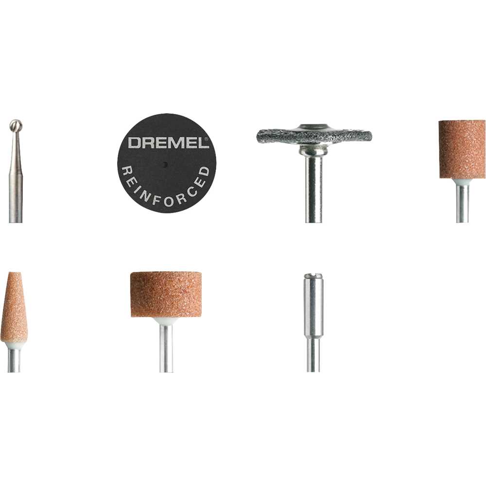 1 Jogo de acessórios para esculpir e gravar, composto por: 1 fresa de gravar de 2,4 mm (107), 1 pedra de esmerilhar de óxido de alumínio de 15,9 mm (8193), 1 pedra de esmerilhar de óxido de alumínio de 9,5 mm (932), 1 pedra de esmerilhar de óxido de alumínio de 6,4 mm (953), 1 mandril (402), 1 escova de aço carbono de 19 mm (428-02) e 10 discos de corte de 32 mm (426B AU).