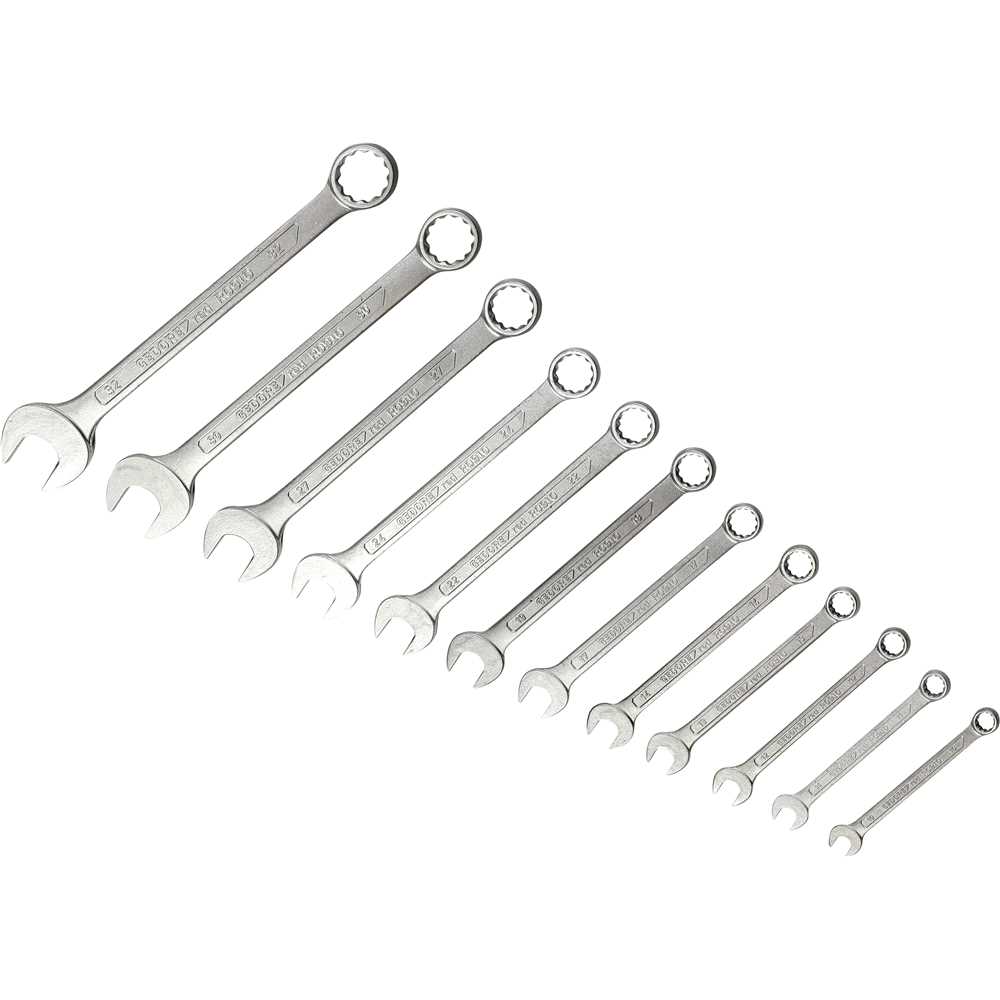 1 Jogo de chaves combinadas, composto por um suporte plástico com 12 peças, sendo: 10 mm, 11 mm, 12 mm, 13 mm, 14 mm, 17 mm, 19 mm, 22 mm, 24 mm, 27 mm, 30 mm e 32 mm.