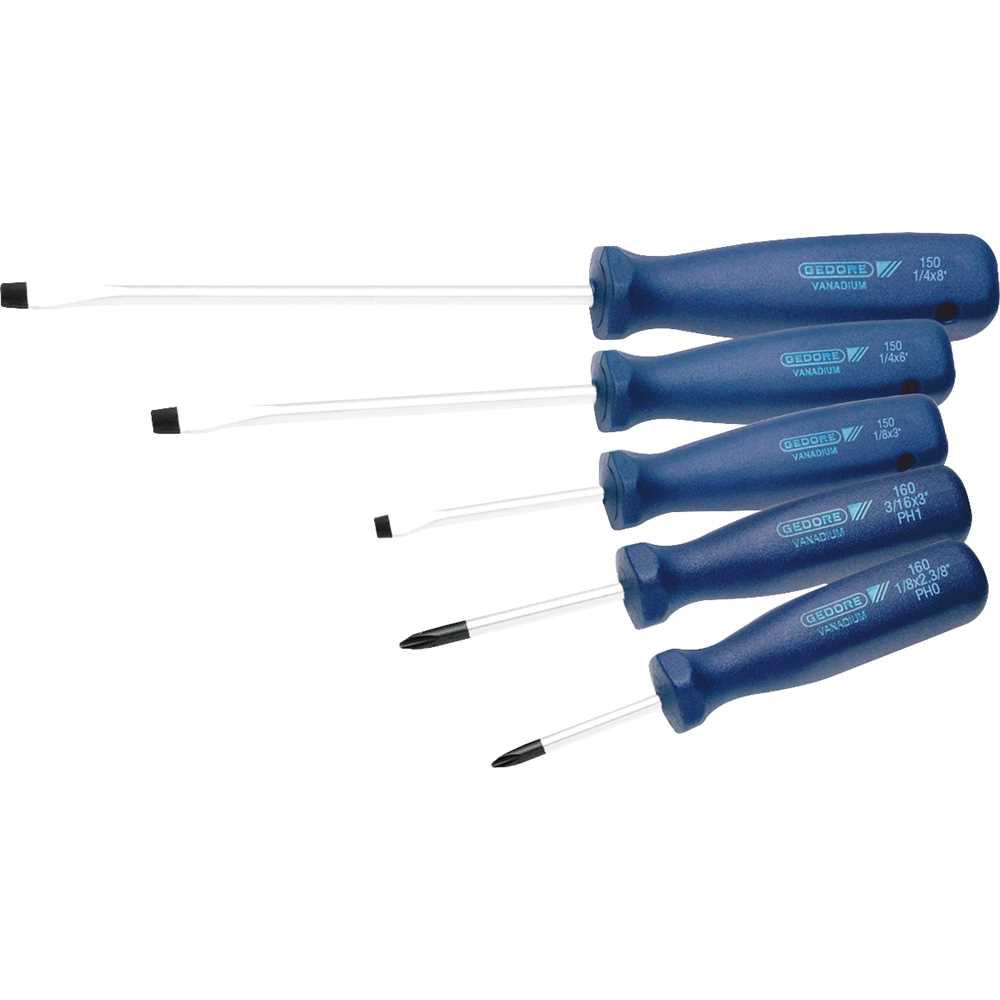 1 Jogo de chaves de fenda/phillips composto por 5 peças, sendo: 1 chave de fenda 1/8" x 3", 1 chave de fenda 1/4" x 6", 1 chave de fenda 1/4" x 8", 1 chave phillips PH0 1/8" x 2.3/8" e 1 chave phillips PH1 3/16" x 3".