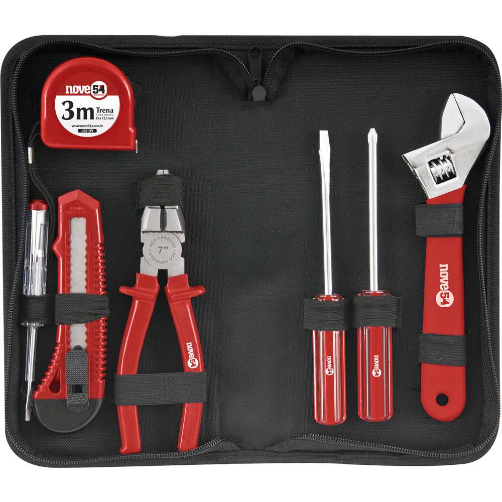 1 Jogo de ferramentas, composto por 8 peças, sendo: 1 trena 3,0 m, 1 chave teste 1/8" x 5.1/2", 1 estilete 18,0 mm, 1 chave de fenda 6,0 mm x 100,0 mm, 1 chave de fenda cruzada/phillips 6,0 mm x 100,0 mm, 1 alicate universal 7" e 1 chave ajustável 8". Acompanha 1 estojo em lona.