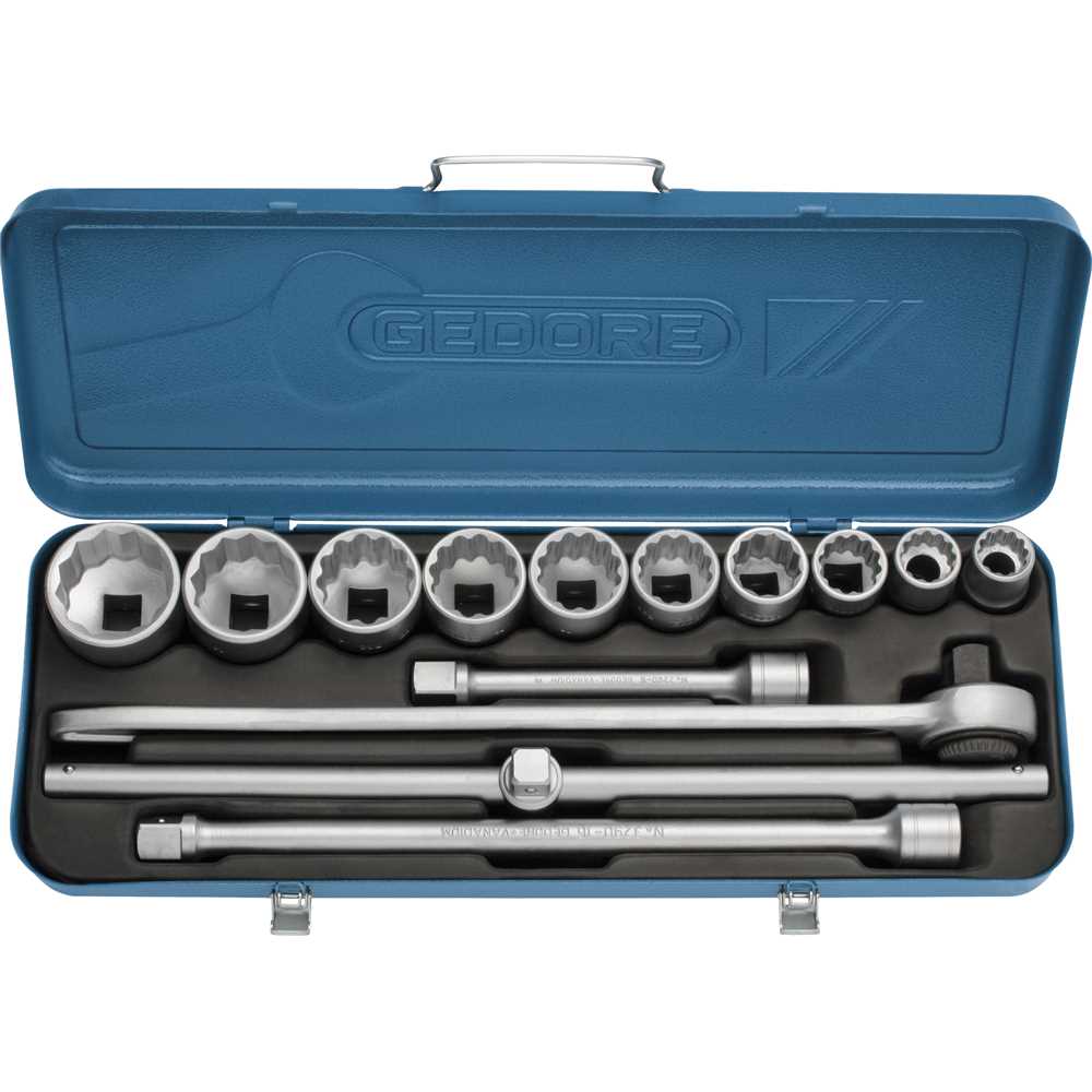 1 Jogo de soquetes, composto por 1 estojo metálico com 14 peças, sendo: 10 soquetes estriados encaixe de 3/4" de 22 mm, 24 mm, 27 mm, 30 mm, 32 mm, 36 mm, 38 mm, 41 mm, 46 mm e 50 mm; 1 catraca reversível encaixe de 3/4"; 1 extensão encaixe de 3/4" x 8"; 1 extensão encaixe de 3/4" x 16" e 1 cabo T encaixe de 3/4".