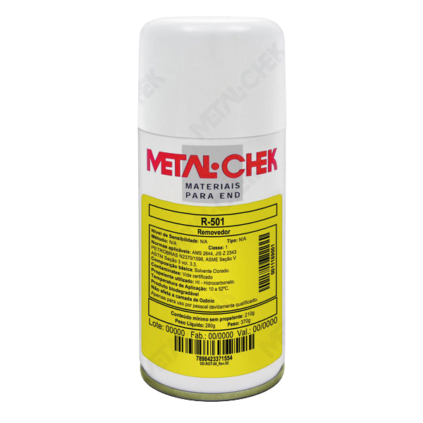 O Removedor R-501 é utilizado no ensaio de líquido penetrante para limpeza prévia da superfície e/ou remoção do excesso do líquido penetrante. Recomendado para pequenas áreas, solvente clorado de secagem rápida.