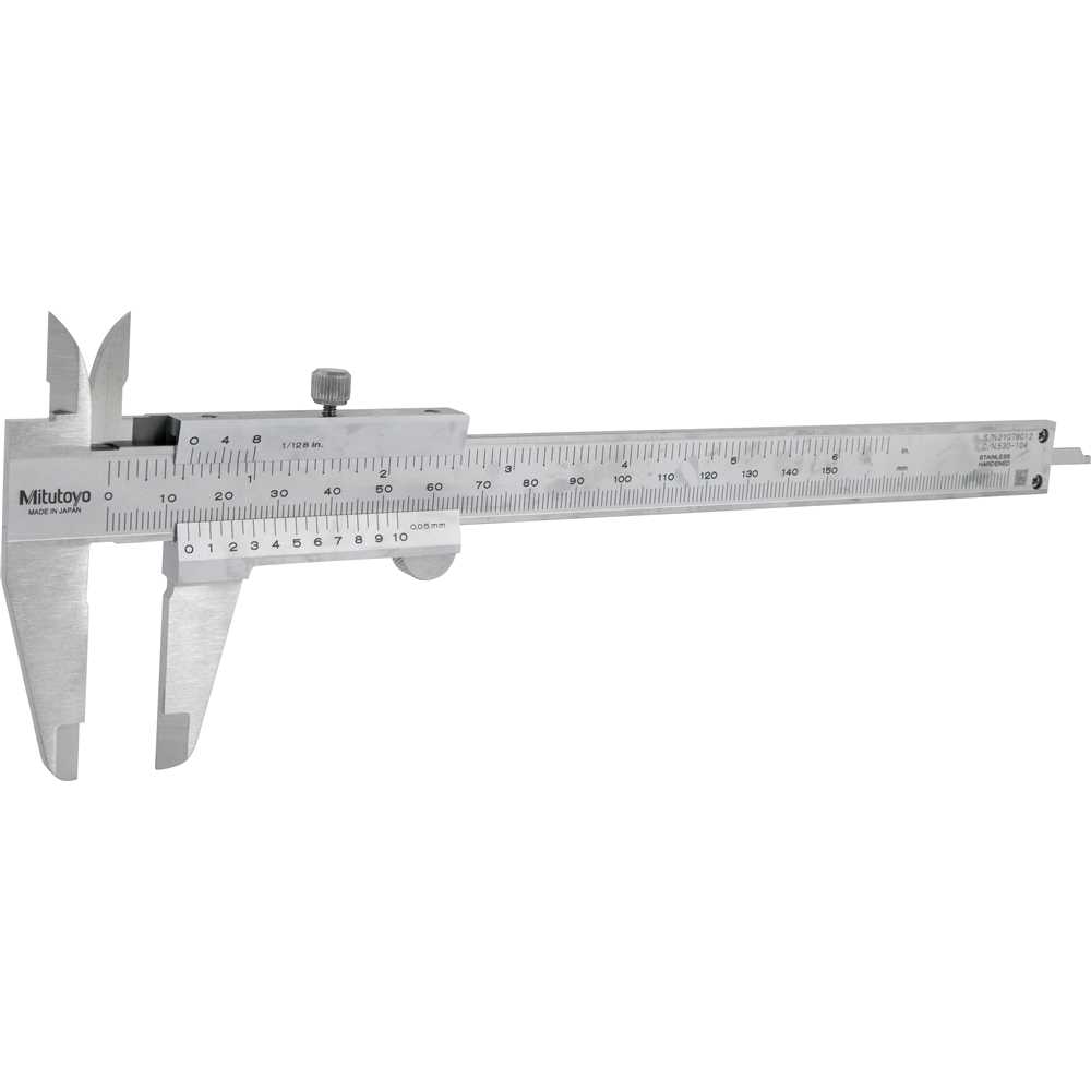 Paquímetro universal analógico, série 530 - modelo convencional da Mitutoyo, com medidor de profundidade. Cursor temperado e impulsor fabricados em aço inoxidável. Escala principal e nônio com acabamento cromado. Possui as faces de medição lapidadas. Com o deslize do cursor sobre guias ressaltadas, impedindo o desgaste da gravação. com capacidade de medição de 0 até 150 mm e 0 até 6" (polegadas).