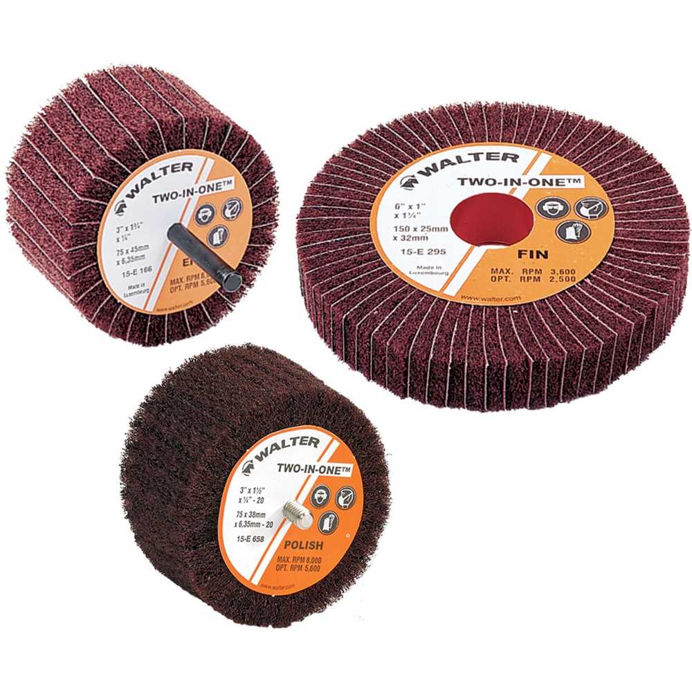 As rodas TWI IN ONE combinam duas etapas de acabamento em uma só. sua taxa de remoção é aproximada as rodas lamelares, deixando um acabamento acetinado uniforme.