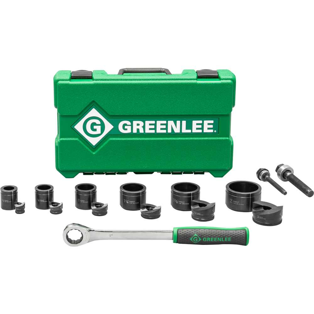 Nova chave de alta alavancagem Greenlee com mecanismo de catraca de cinco graus. O perfil de punção Slug-Buster® divide os slugs para facilitar a remoção do slug. Borda serrilhada em punções para melhor aderência. Marcações a laser para identificação rápida das peças. Marcações de alinhamento para maior precisão. Rebaixo com rosqueamento fácil que ajuda a eliminar o rosqueamento cruzado.